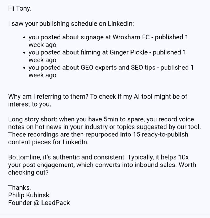 Today, this strategy is all but dead. Because AI is automating this process to death. Recipients (including you!) have caught on.